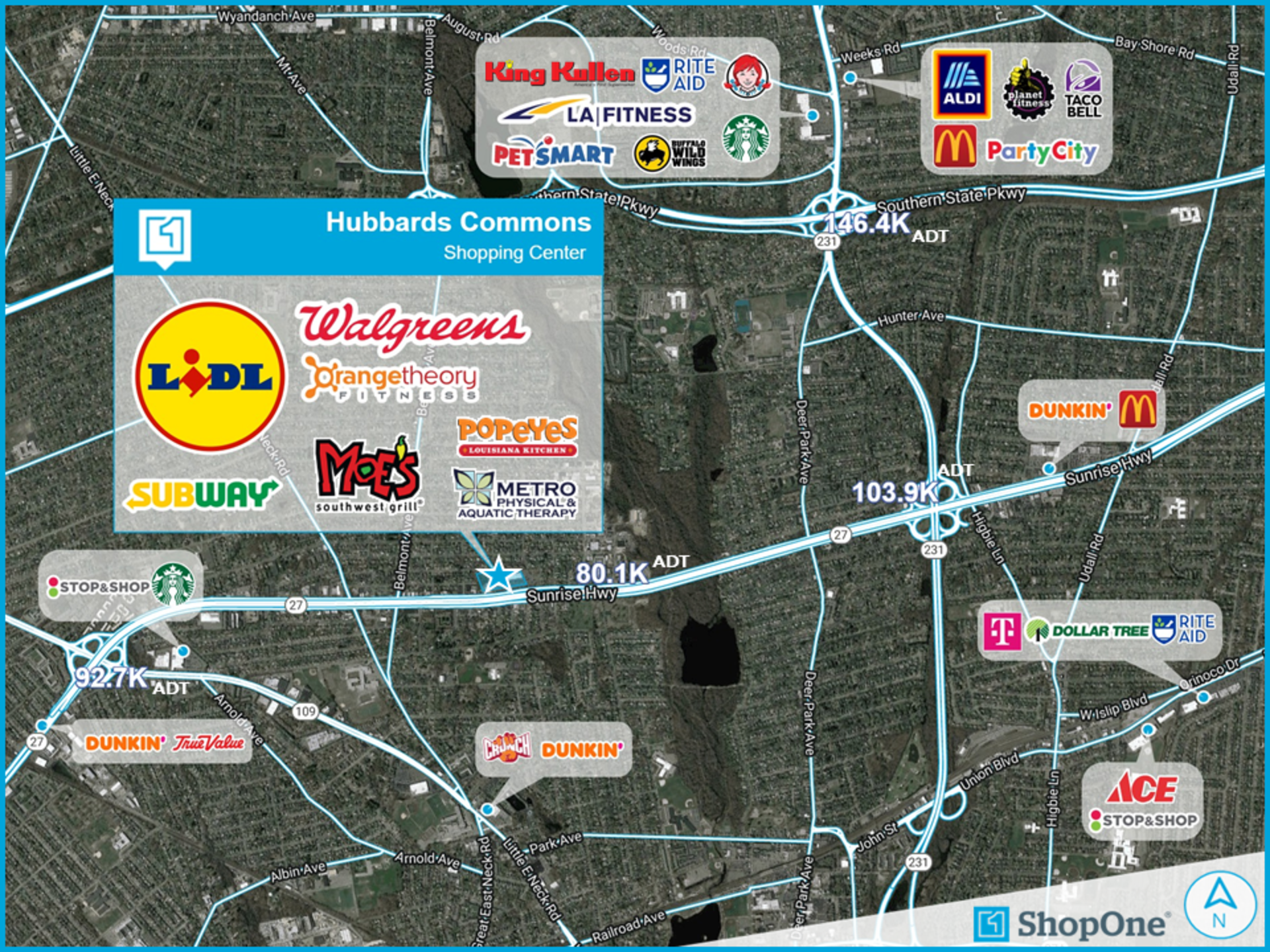 Hubbards Commons Shopping Center is located in West Babylon, Long Island, NY on the corner of Sunrise Highway and Hubbards Path. The center is anchored by Lidl, Walgreens Pharmacy, and Orange Theory Fitness. Hubbards Commons provides a dynamic mix of necessity-based grocer retail and complimentary local retailers. New tenants joining Hubbards Commons in the new 10,849 SF multi-tenant building are Popeye's, KidStrong, Moe's, and Metro Physical Therapy.