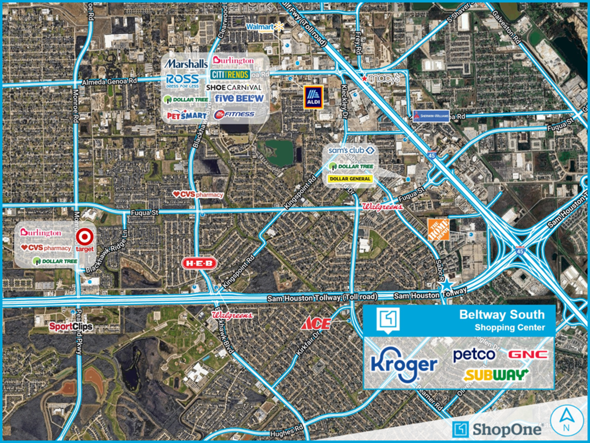 Beltway South is a 114,099 square foot grocery-anchored neighborhood shopping center in southeast Houston, TX. The center is anchored by a recently remodeled Kroger. Positioned at I-45 & Sam Houston Tollway, the center benefits from direct exposure to 285,000 VPD. Beltway South draws its healthy consumer base from dense single family residential and newer multi-family, as well as commercial developments along the Beltway corridor.