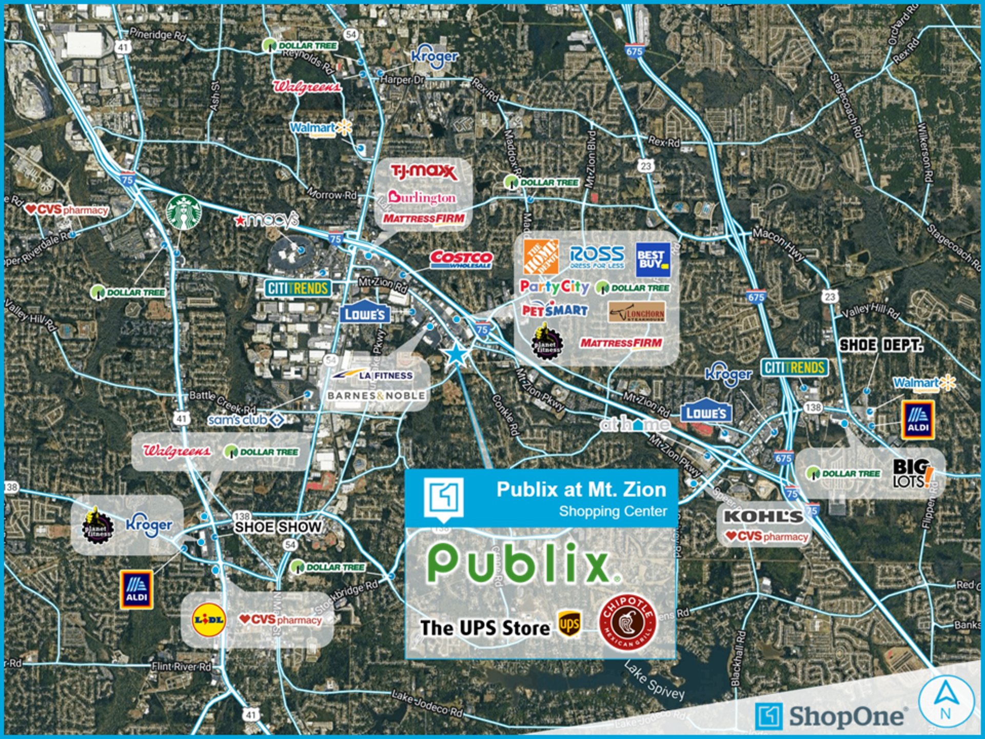 Publix at Mt. Zion is a 79,031 SF, Publix-anchored neighborhood center located in Morrow, GA in the Atlanta MSA. The center is situated at the highly traveled and signalized intersection of Mt. Zion Road and Mt. Zion Boulevard, just south of Mt. Zion Road’s intersection with I-75. Over 65,300 vehicles pass through the intersection daily, with 149,000 additional vehicles also passing the property along I-75.