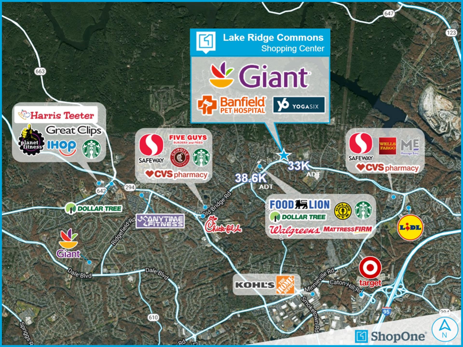 Lake Ridge Commons is a 74,367 square foot neighborhood shopping center, anchored by Giant, located 20 miles southwest of Washington D.C in the affluent suburb of Woodbridge, Virginia. Situated at the corner of Old Bridge Road and Hedges Run Drive, Giant has operated at this location since construction in 1987 and serves over 80,000 residents within a three-mile radius.