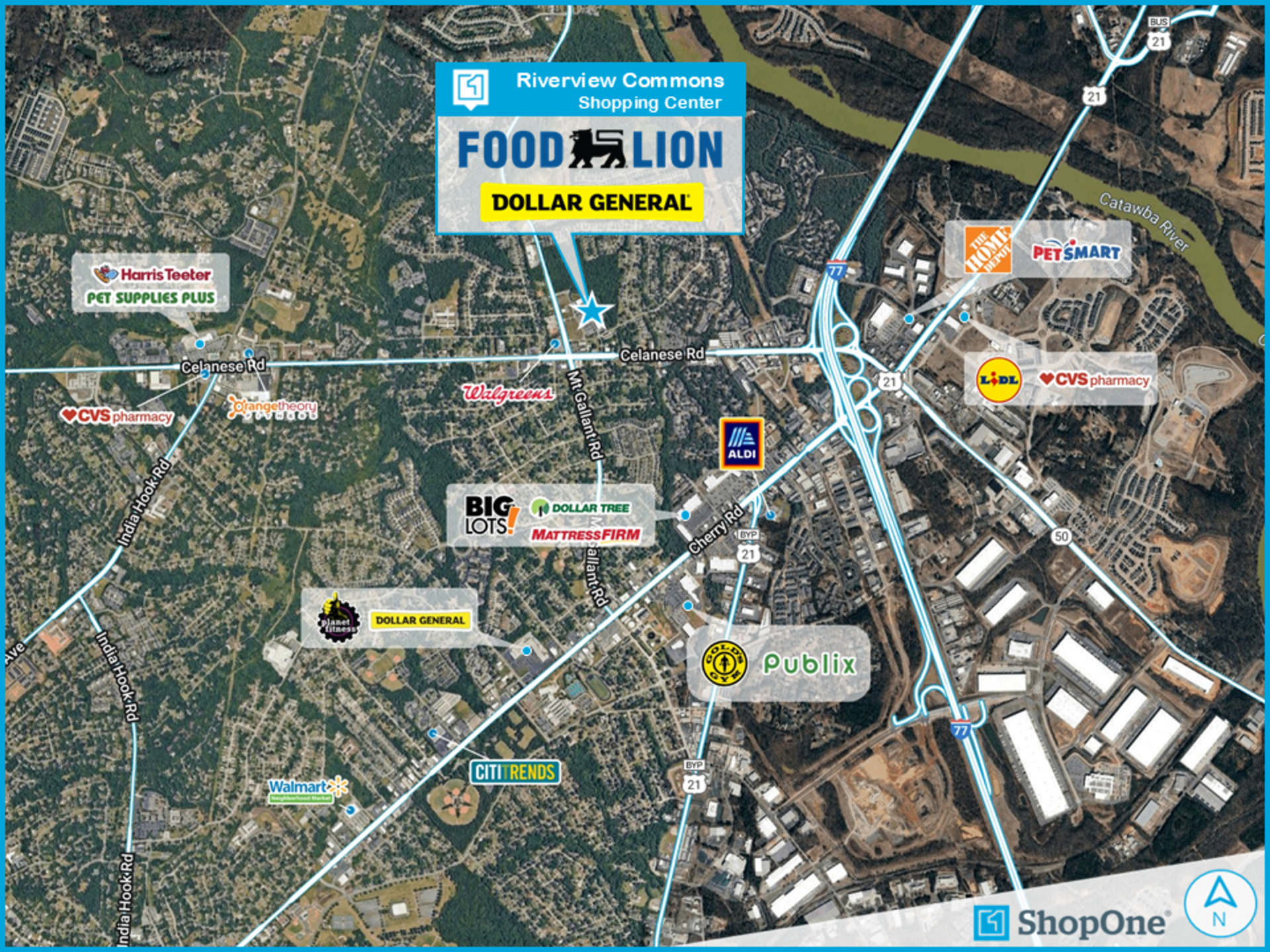 Riverview Commons is a 59,020 SF shopping center anchored by Food Lion. Located in the Charlotte MSA, in the city of Rock Hill, SC, at the intersection of Celanese Road and Mt. Gallant Road seeing almost 75,000 VPD. The center features a good mix of local and national tenants including Dollar General. The property has an expansion opportunity with a pad of vacant land adjacent to the Food Lion.