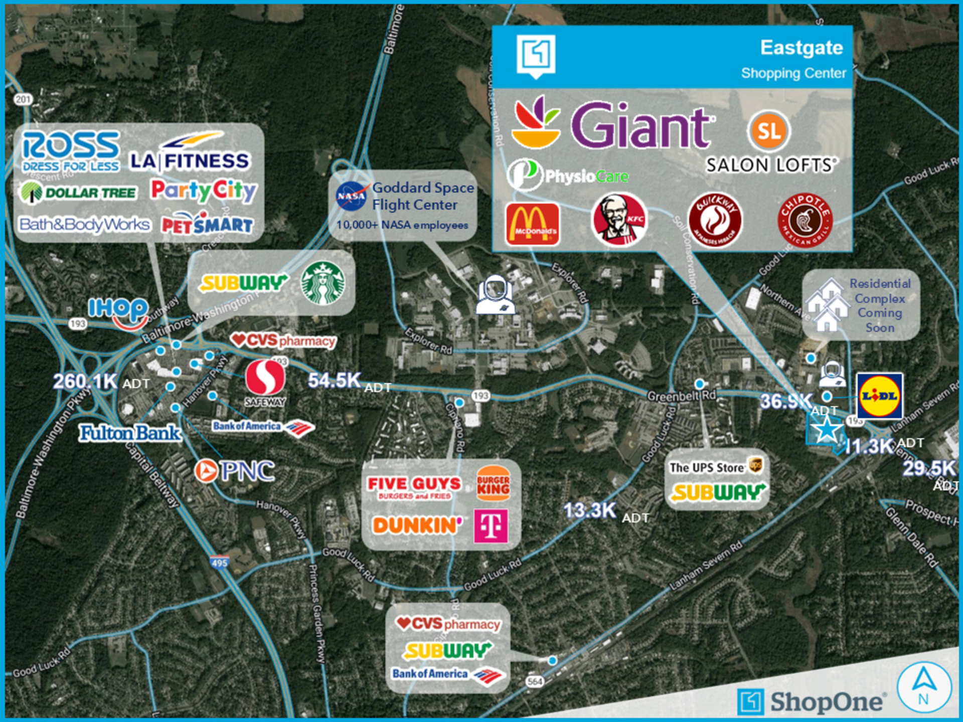 Eastgate Shopping Center is anchored by Giant Food and located along highly-traveled Greenbelt Road (MD-193). The plaza features outstanding visibility and benefits from superb regional access to both Baltimore-Washington Parkway (I-295) and Capital Beltway (I-495). There is an extensive daytime population nearby, which adds to the regional draw of the center. Approximately 88,000 daytime employees work within a five-mile radius. Several tenants have joined the center since ShopOne’s acquisition in 2018, including, but not limited to, Chipotle, Salon Lofts, McDonald's, KFC, Quickway Japanese Hibachi, Eye Site, Smiles Pediatric Dental Care, PhysioCare, and Pizza Bolis.